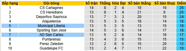 Bảng xếp hạng giải VĐQG Costa Rica 2025/26
