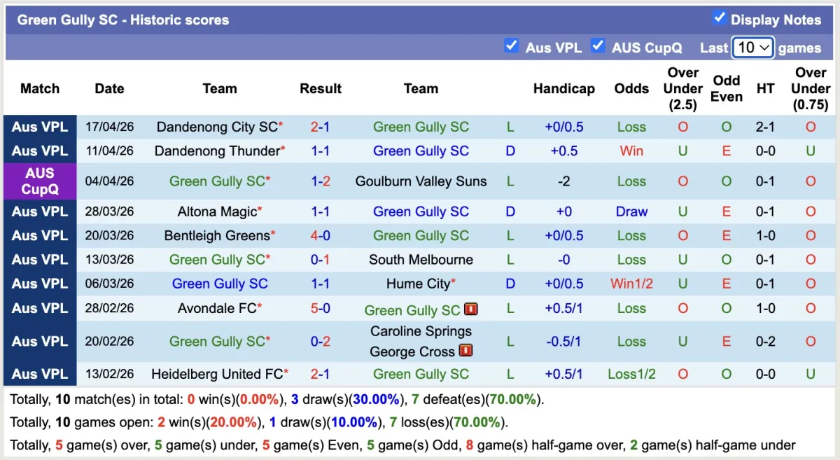 -Thống kê phong độ 10 trận đấu gần nhất của Green Gully SC