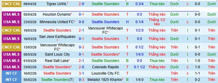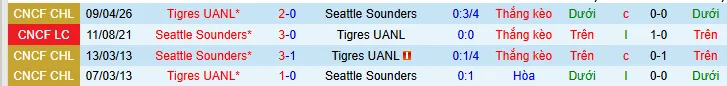 + Trong 4 lần Seattle Sounders đối đầu với Tigres UANL, thì đội nào là chủ nhà đều giành chiến thắng, trong đó thắng kèo châu Á 3 lần, trận còn lại hòa tiền.