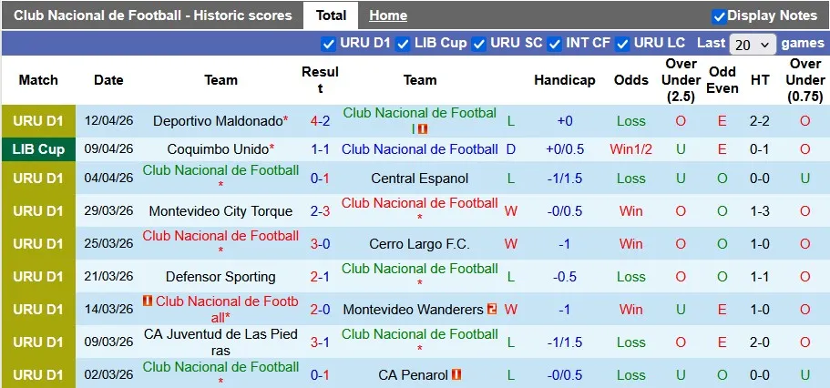 Thống kê về phong độ 10 trận đấu gần nhất của Club Nacional.