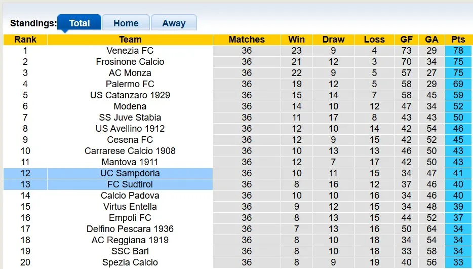 Phía bên đối diện, mọi thứ cũng tương tự với đội khách Sudtirol. Họ đứng ngay phía sau đối phương với 1 điểm ít hơn, hơn đến 6 điểm so với nhóm nguy hiểm. Ngay cả khi Sudtirol để thua cả 2 trận cuối, họ có lẽ cũng vẫn trụ hạng thành công.