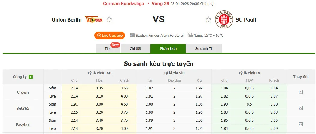 Nhận định soi kèo Union Berlin vs St. Pauli, 20h30 ngày 5/4 tại VĐQG Đức. Phân tích tỷ lệ kèo, dự đoán kết quả Union Berlin đấu với St. Pauli từ tỷ lệ châu Âu, châu Á qua các chuyên gia hàng đầu.