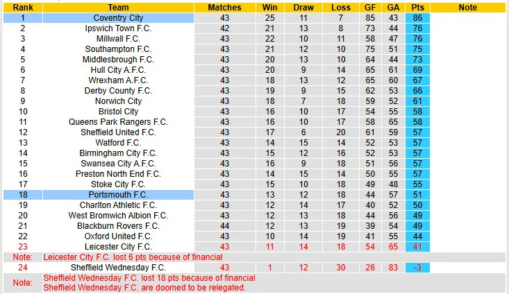 Còn ở trận đấu đêm nay, Coventry dù thi đấu trên sân nhà song không dễ giành trọn 3 điểm. Nhắc lại, đối thủ của họ là cái tên đang vào phom phong độ Portsmouth. Nếu chỉ tính trong 3 lượt trận mới đây, đội khách Portsmouth hoàn toàn vượt trội Coventry khi giành về trọn vẹn 9 điểm. Trong đó, họ lần lượt đánh bại những đối thủ đáng gờm là Leicester, đội nhì bảng Ipswich hay đội xếp thứ 5 Middlesbrough. Dù thi đấu xa nhà những nếu cứ thi đấu đúng với phong độ, Portsmouth đủ tự tin giành điểm trước Coventry. Cần nhắc thêm, Portsmouth vẫn còn đó nguy cơ xuống hạng và họ sẽ chiến đấu với 100% sự tập trung ở trận đấu đêm nay.