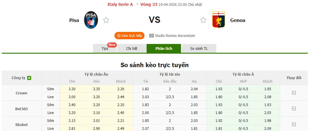 Nhận định soi kèo Pisa vs Genoa, 23h00 ngày 19/4 tại VĐQG Italia. Phân tích tỷ lệ kèo, dự đoán kết quả Pisa đấu với Genoa từ tỷ lệ châu Âu, châu Á qua các chuyên gia hàng đầu.