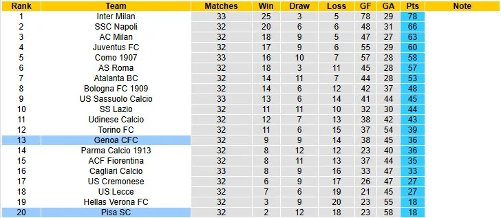 Thống kê phong độ, lịch sử đối đầu của Pisa vs Genoa
