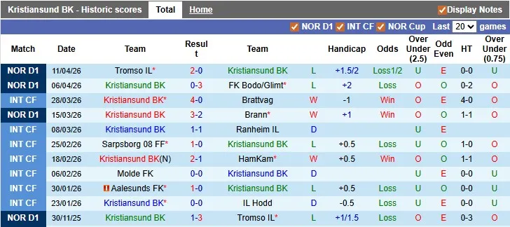 Thống kê phong độ 10 trận đấu gần nhất của Kristiansund