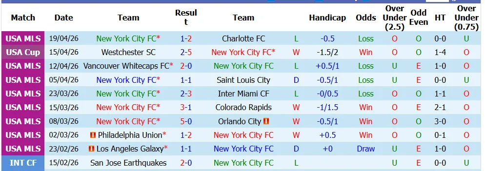 Dưới đây là thống kê phong độ 10 trận đấu gần nhất của New York City.