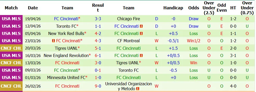 Dưới đây là thống kê phong độ 10 trận đấu gần nhất của Cincinnati.