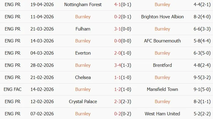 Thống kê phong độ 10 trận đấu gần nhất của Burnley