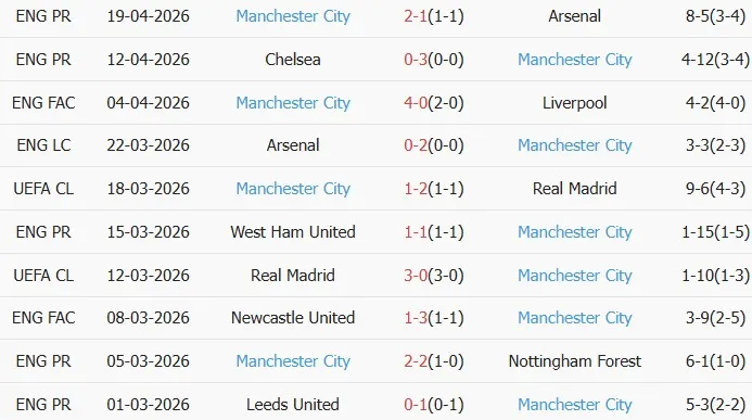 Thống kê phong độ 10 trận đấu gần nhất của Man City