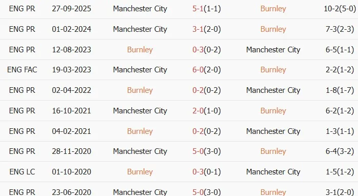Lịch sử đối đầu Burnley vs Man City