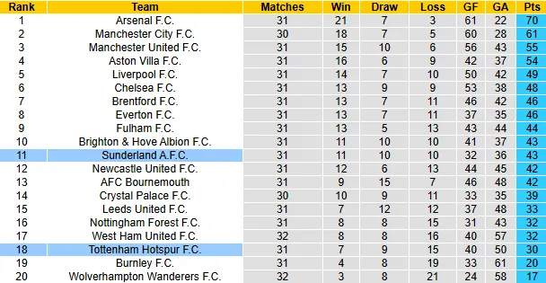 Thống kê phong độ, lịch sử đối đầu Sunderland vs Tottenham