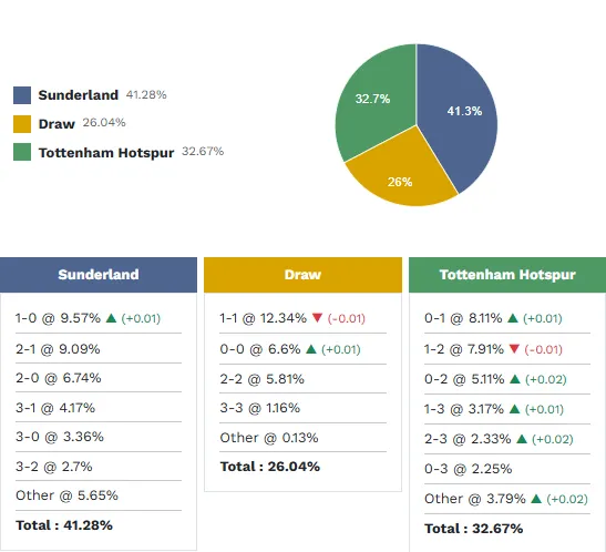 Trong đó, Sunderland thắng với tỷ số 1-0 được kỳ vọng xảy ra với 9.57%. Được biết, tỷ số hòa 1-1 cũng dễ xảy ra khi xác suất là 12.4%. Trong khi đó, Tottenham thắng với tỷ số 1-0 có tỷ lệ là 8.11%.
