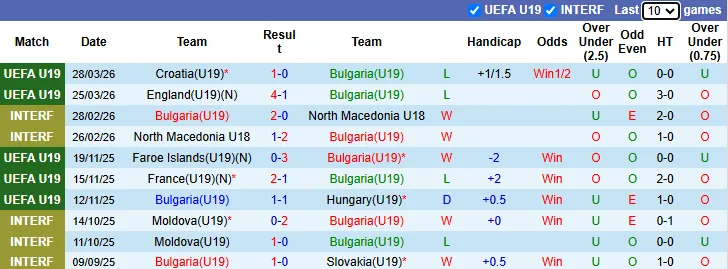 Thống kê phong độ 10 trận gần nhất của U19 Bulgaria
