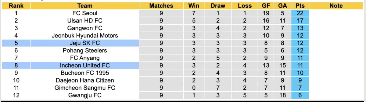 Ở phía đối diện, Incheon United đã giành được suất thăng hạng sau khi vô địch K League 2. Mặc dù phải đối mặt với nhiều khó khăn ở môi trường cạnh tranh cao hơn, họ vẫn thể hiện được bản thân và hiện đang đứng ở vị trí thứ 8 với 11 điểm.
