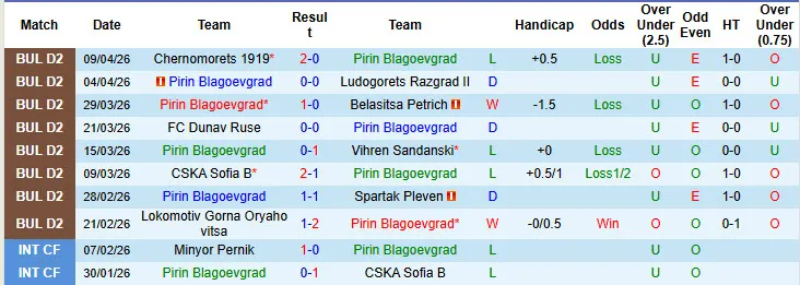 Thống kê phong độ 10 trận đấu gần nhất của Pirin Blagoevgrad
