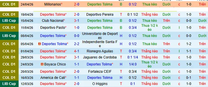 + Tolima thua 2/3 trận gần nhất trên sân nhà theo kèo châu Á.