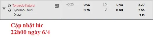 Đang chơi ổn định dần, lại được chơi trên sân nhà nhưng Torpedo Kutaisi lại không được đánh giá cao hơn bao nhiêu so với Dinamo Tbilisi. Mức -1/4 thiếu tin cậy với đội chủ nhà. Từ đầu mùa, hai đội cũng đều thắng kèo 2 trận.