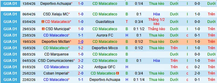 + Malacateco thắng 4 hòa 4 thua 12 trong 20 trận gần đây trên các mặt trận.