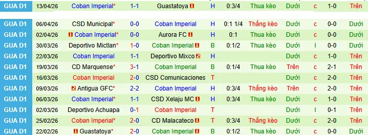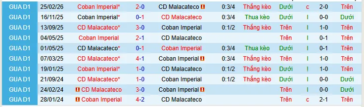 + Malacateco thắng thua trong trận đối đầu gần nhất với Coban Imperial theo kèo châu Á.