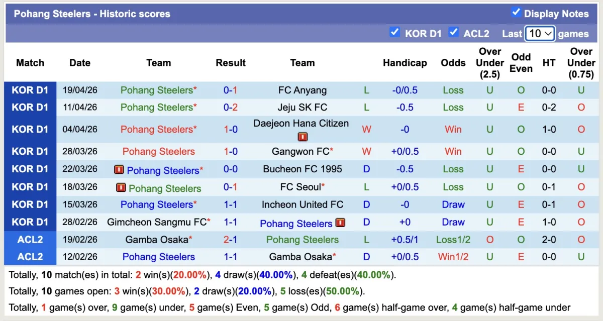 -Thống kê phong độ 10 trận đấu gần nhất của Pohang Steelers