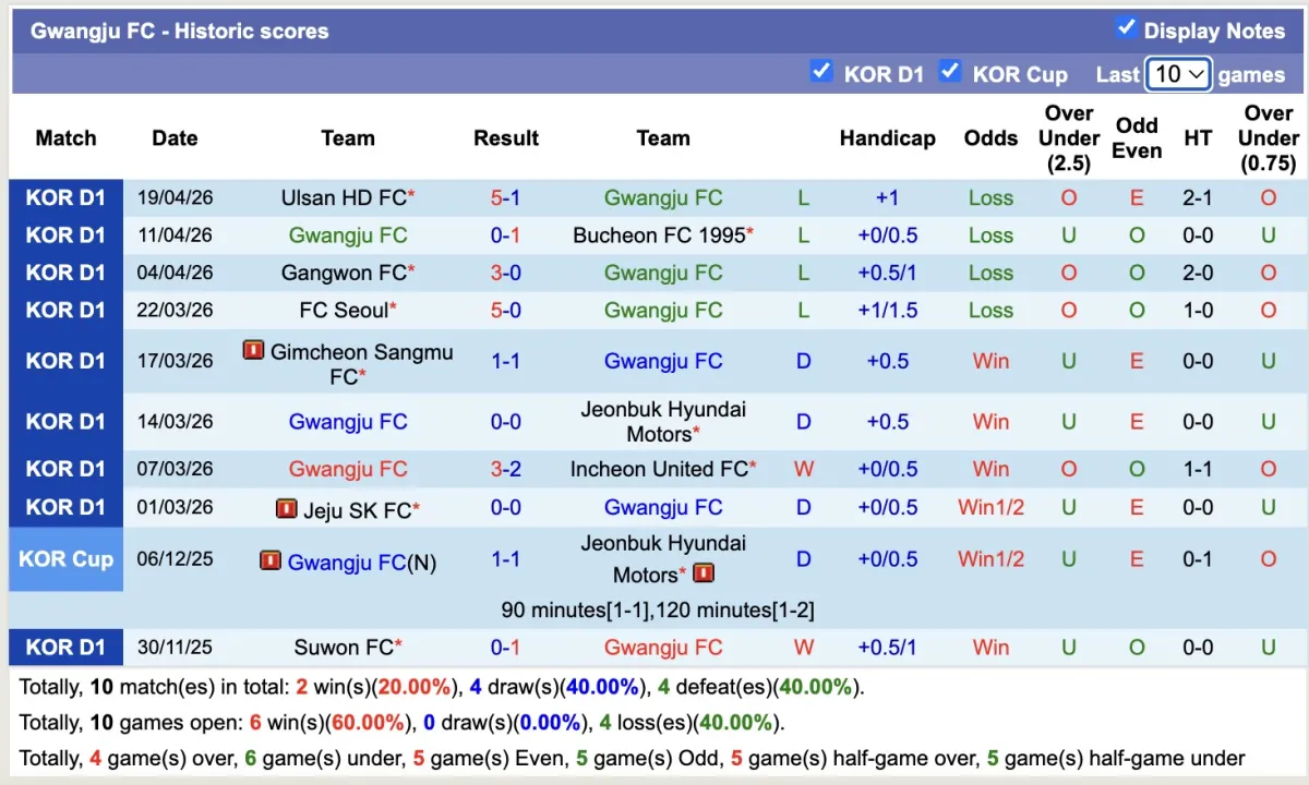 -Thống kê phong độ 10 trận đấu gần nhất của Gwangju