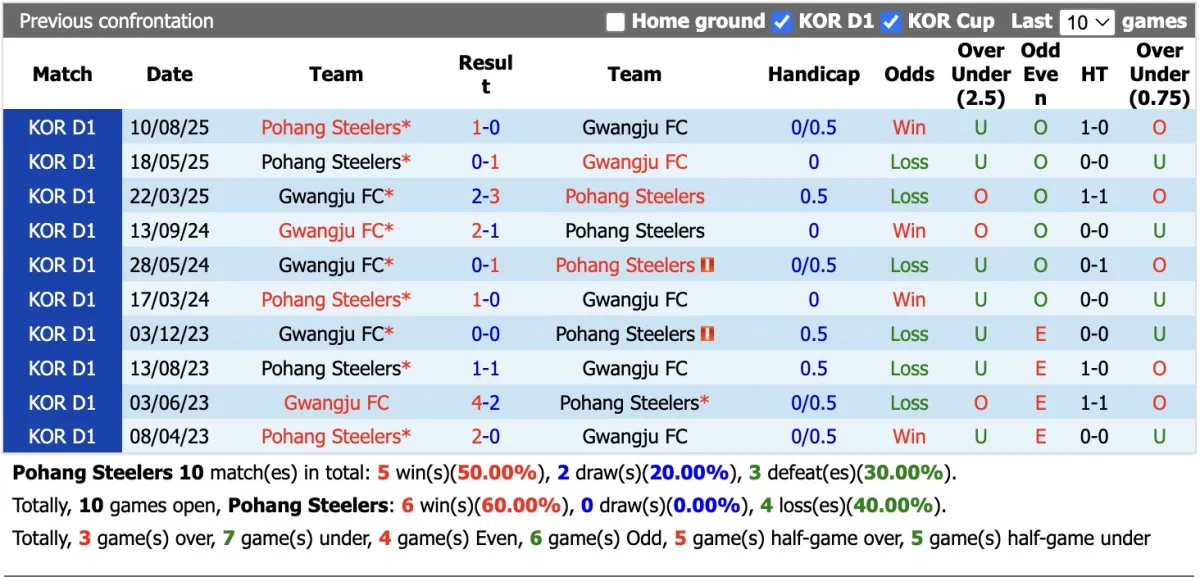 4/6 lần đối đầu gần nhất giữa hai câu lạc bộ Pohang Steelers đều thắng kèo. Gwangju đang chìm sâu vào khủng hoảng và 4 vòng đấu gần đây đội bóng này đều thua kèo. Nhiều khả năng đội chủ nhà vẫn là một chọn lựa tốt cho giới đầu tư.