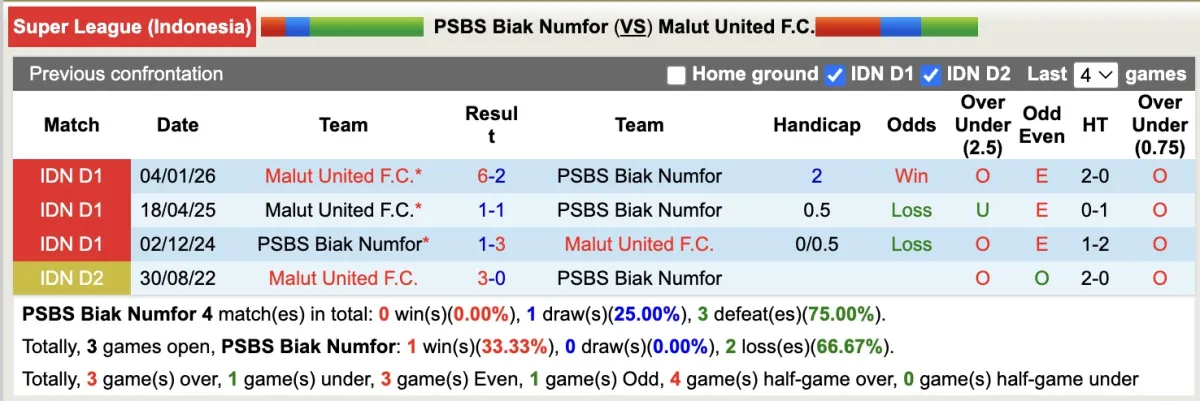 Trong trận đối đầu lượt đi, Malut United được đánh giá rất cao nhưng đã dễ dàng thắng kèo với chiến thắng cách biệt đến 4 bàn. 12 vòng đấu liên tiếp của PSBS Biak Numfor không biết đến mùi chiến thắng trong đó nếm đến 10 trái đắng. Có lẽ đội khách vẫn đáng tin trận này.