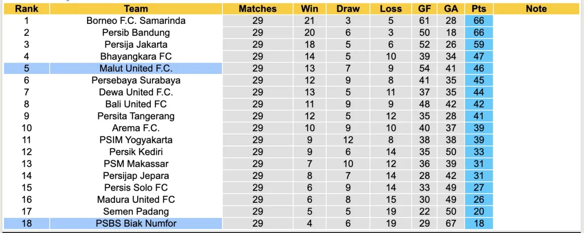 Nhưng đến mùa giải năm nay, PSBS Biak Numfor đang hụt hơi và họ đang rất khó khăn. Sau 29 vòng đấu tại giải VĐQG Indonesia đội bóng này chỉ sở hữu vỏn vẹn 4 chiến thắng, hoà 6 và nếm đến 19 thất bại, hiện họ đứng bét bảng.