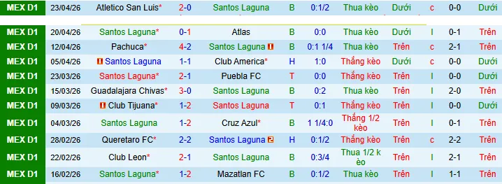 + Santos Laguna thắng 5 thua 4 trong 9 trận gần đây theo kèo châu Á.