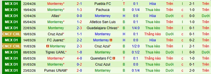 + Monterrey đã không vượt qua được mức chấp -0.5 trong 8/10 trận gần đây nhất của họ.