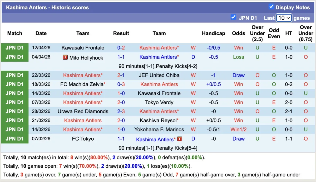 -Thống kê phong độ 10 trận đấu gần nhất của Kashima Antlers