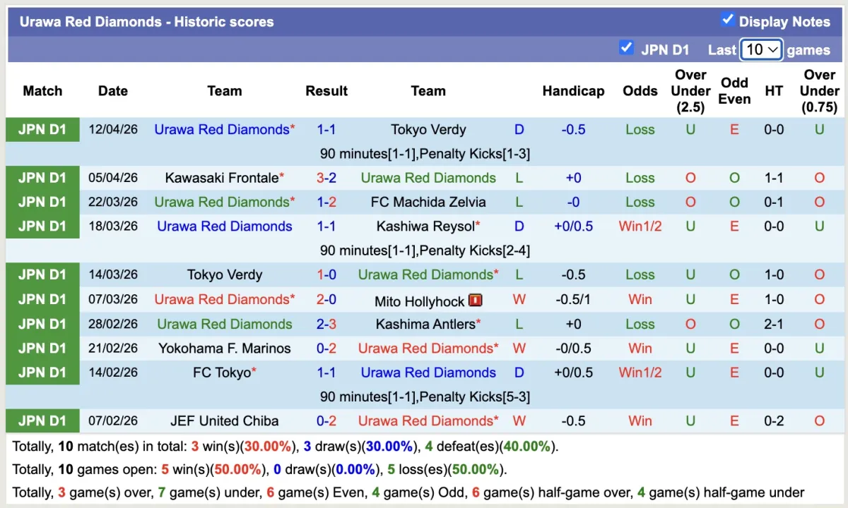 -Thống kê phong độ 10 trận đấu gần nhất của Urawa Red Diamonds