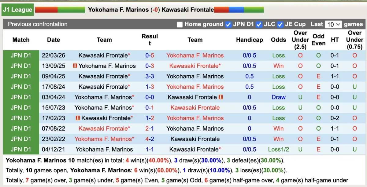 3 lần đối đầu gần nhất giữa hai câu lạc bộ mà Yokohama F. Marinos được thi đấu trên tổ ấm đều không thắng kèo và có đến 2 trận thua kèo. 3/4 vòng đấu gần đây đội chủ nhà không vượt ải Handicap, trong khi đó 2/3 trận liên tiếp của Kawasaki Frontale đều thắng kèo. Do đó có thể đội khách sẽ đáng tin ở kèo châu Á.