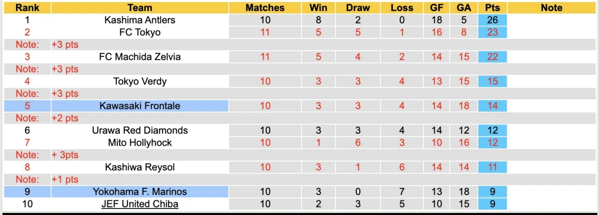 -Thống kê phong độ 10 trận đấu gần nhất của Kawasaki Frontale