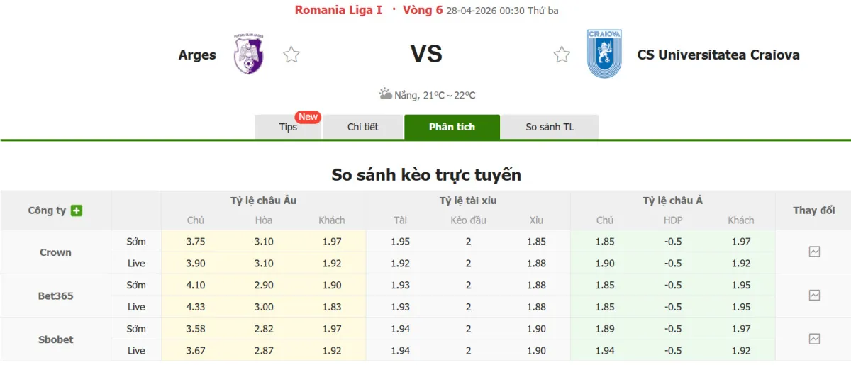 Nhận định soi kèo Arges vs Universitatea Craiova, 00h30 ngày 28/4 tại VĐQG Romania. Phân tích tỷ lệ kèo, dự đoán kết quả Arges đấu với Universitatea Craiova từ tỷ lệ châu Âu, châu Á qua các chuyên gia hàng đầu.