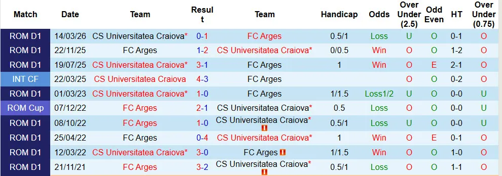 Thống kê phong độ, lịch sử đối đầu của Arges vs Universitatea Craiova