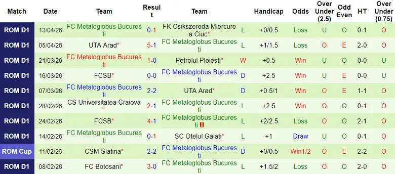 Trong 2 lần gặp nhau gần đây tại giải VĐQG Romania 2025/26, Metaloglobus đều thua Botosani. Lần đầu tiên, Metaloglobus thua với cách biệt 2 bàn không gỡ trên sân nhà, và sau đó thua 0-3 trên sân khách.