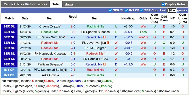 – Thống kê phong độ 10 trận đấu gần nhất của Radnicki Nis