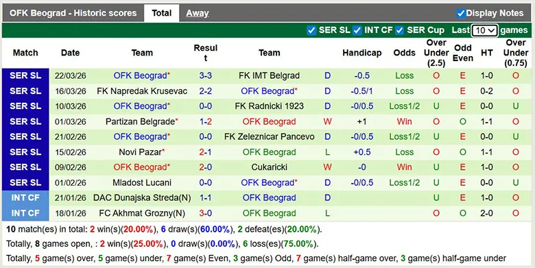 – Thống kê phong độ 10 trận đấu gần nhất của OFK Beograd