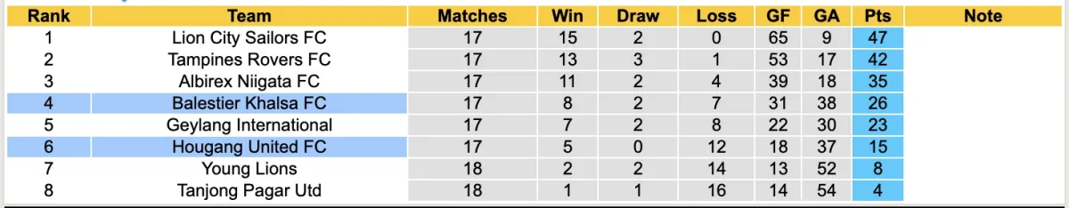 Balestier Khalsa ở vòng đấu gần nhất đã thi đấu đầy kiên cường trước một trong những câu lạc bộ hàng đầu Singapore là Tampines Rovers FC và chỉ nếm thất bại với tỉ số tối thiểu 1-2. Cũng cần nhấn mạnh rằng 2 trận trước đó họ đều thắng.
