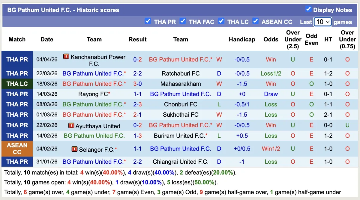 -Thống kê phong độ 10 trận đấu gần nhất của BG Pathum United