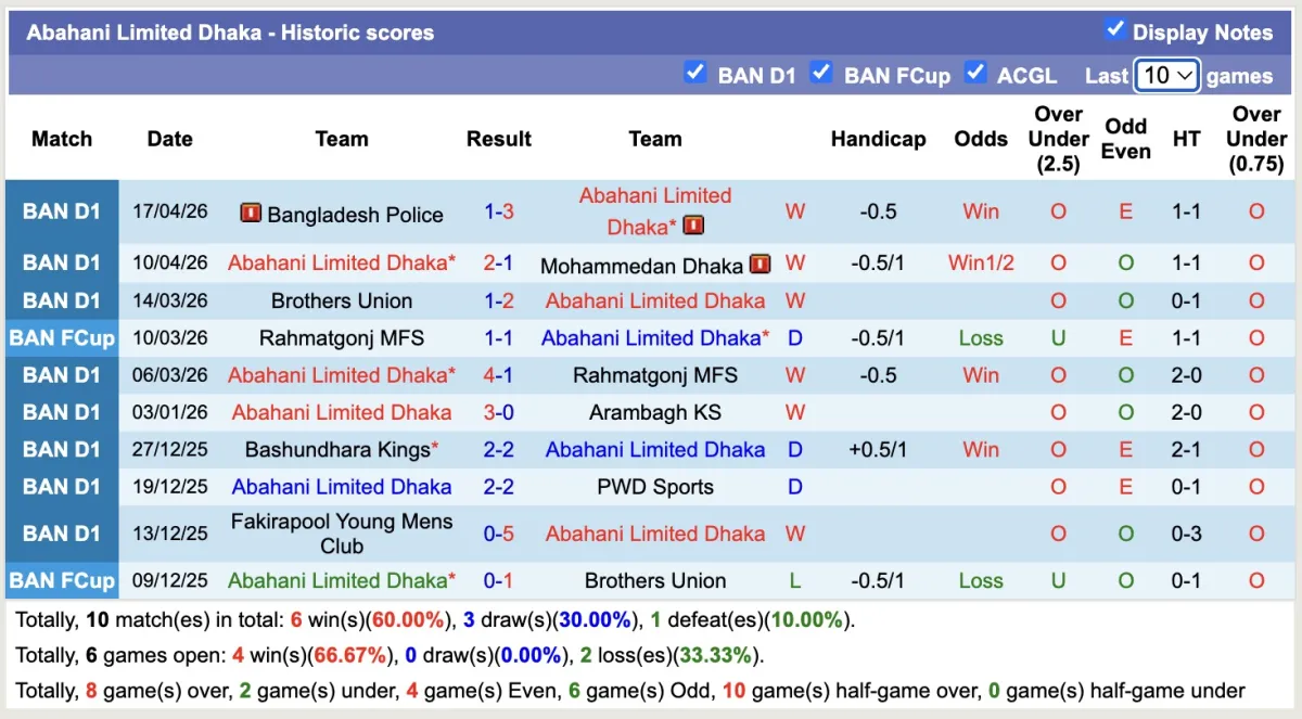 -Thống kê phong độ 10 trận đấu gần nhất của Abahani Limited Dhaka