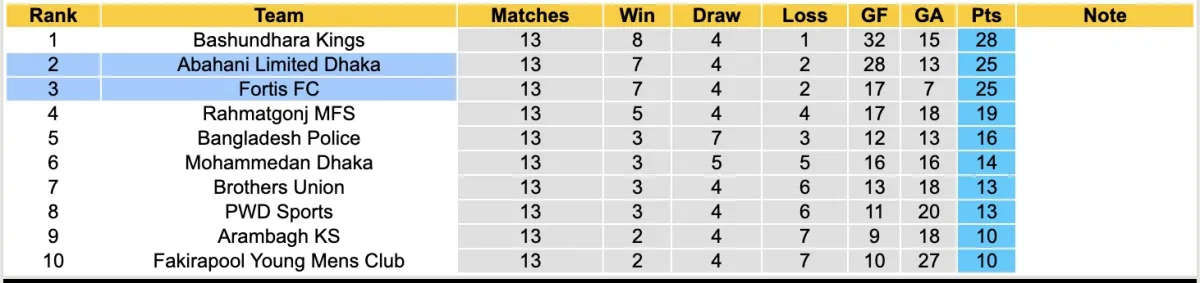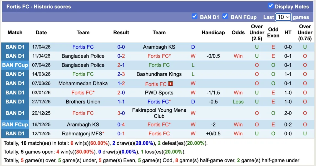 Thực tế nếu tính ở riêng giải VĐQG Bangladesh, Fortis đang chơi không tệ khi 13 vòng đấu đã qua chỉ nếm 2 thất bại và giành đến 7 chiến thắng. Với 25 điểm có được đội bóng này đang đứng thứ 3, bằng điểm Top2 nhưng kém hiệu số.