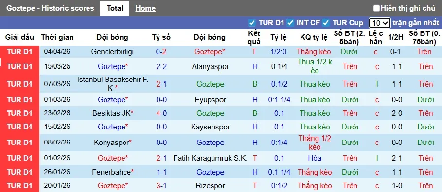 Thống kê phong độ 10 trận đấu gần nhất của Goztepe