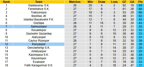 Thống kê phong độ, lịch sử đối đầu Samsunspor vs Konyaspor
