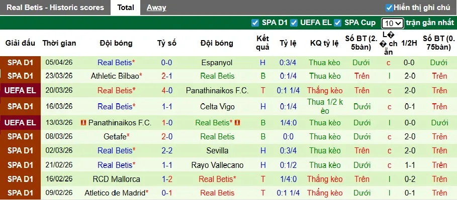 Thống kê phong độ 10 trận đấu gần nhất của Real Betis