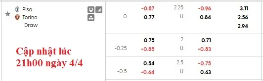Tỷ lệ thắng kèo của Pisa từ đầu mùa là 13/30 trận, còn Torino là 15/30. Đội khách vốn không bị đánh giá thấp hơn ở trận đấu này, thậm chí với kèo 0:0, giá ăn của họ còn luôn bị ghìm ở mức rất thấp. Đó là động thái cho thấy Torino đáng tin cậy.