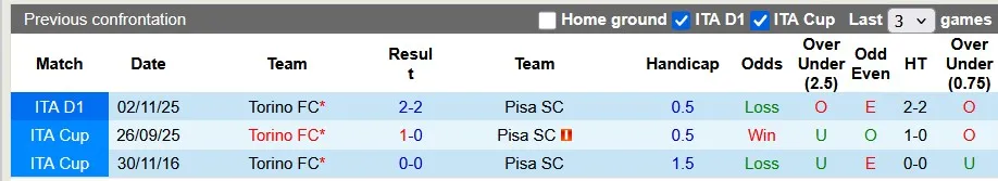 Thống kê phong độ, lịch sử đối đầu của Pisa đấu vs Torino