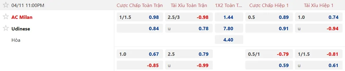 Sàn giao dịch châu Á ghi nhận mức kèo AC Milan chấp 1 1/4 trái, tỷ lệ mà Rossoneri không thực sự có duyên ở những trận đối đầu với Udinese, khi 2 trận gần nhất xuất hiện họ đều chỉ có chiến thắng tối thiểu và khiến các nhà đầu tư ôm hận. 3 trận sân nhà gần đây chấp dao động từ 1 1/4 đến 1 1/2 trái cũng chứng kiến AC Milan để thua kèo châu Á. Với Udinese, đội khách bất bại theo châu Á 5 trận gần nhất, bao gồm 4 chiến thắng và 1 trận hòa.